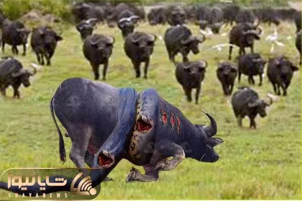 از جذابیت های حیات وحش؛ پیتون پیچیده دور بوفالو در حالی که صدتا بوفالو وایسادن تماشا