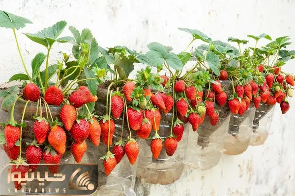 کاشت و برداشت خانگی؛ توت فرنگی هایی که تو بطری های پلاستیکی کاشتن چه دلبر آویزونن