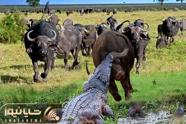 از جذابیت های حیات وحش؛ کروکودیل صورت بوفالو رو کند گله وایساد فقط تماشا کردن