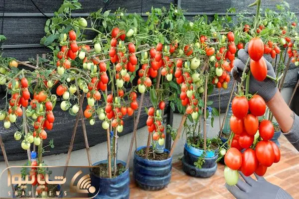 کاشت و برداشت خانگی؛ چقدر خلاقانه گوجه ها رو تو ظرف پلاستیکی کاشتن فقط آبیاری کردنش