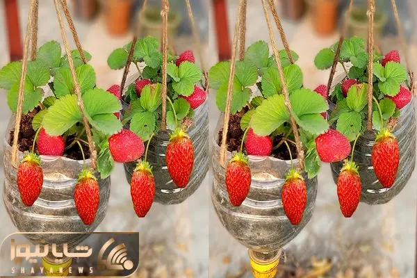 کاشت و برداشت خانگی؛ توت فرنگی هایی که تو بطری های پلاستیکی دوغ کاشته محشر شدن