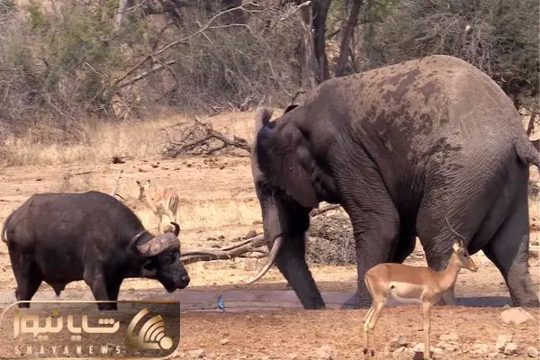 از جذابیت های حیات وحش؛ فیل و بوفالو دو ابر غول جنگل سر قلمرو با هم جنگ میکنن