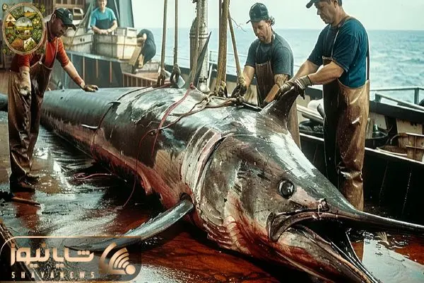 پس از صید اره ماهی غول پیکر از اقیانوس شکم این آبزی عظیم الجثه را شکافته و آن را برای قطعه قطعه شدن در اختیار قصاب قرار میدهند.