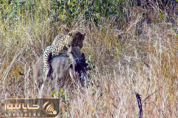 از بدایع حیات وحش؛ گراز بی خبر از همه جا سرگرم خودش بود که پلنگ خمشگین از راه رسید