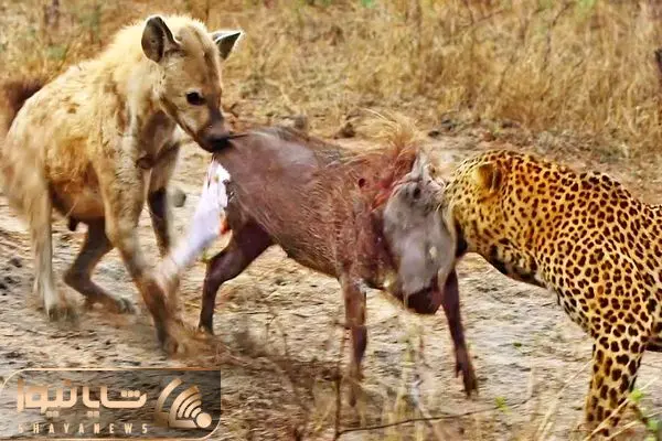 از بدایع حیات وحش؛ پلنگ سر خوک و به نیش کشیده و کفتار هم دمشو از وسط جر خورد