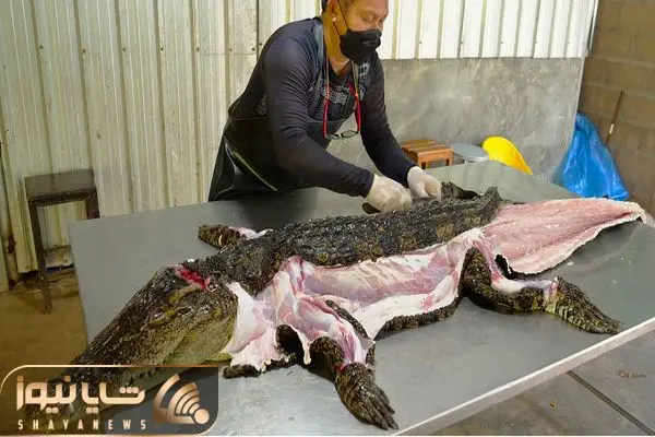 فرآوری تمساح؛ با ظرافت خاصی پوست کروکودیل واس کت جدا میکنه گوشتشو واس استیک