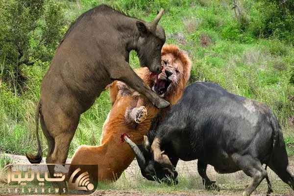 از بدایع حیات وحش؛ شیر به گله بوفالو یورش برد اونا هم با سم و شاخ سوراخش کردن