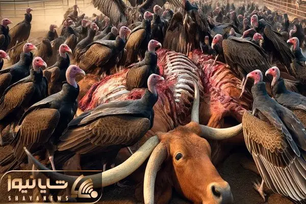 از بدایع حیات وحش؛ کرکسهای لاشخور چشای گاو از کاسه درآوردن گوشتشو ریش کردن