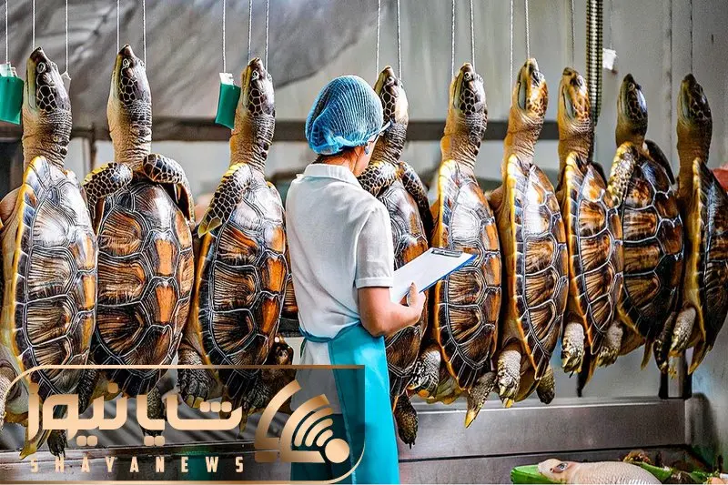 فرآوری لاکپشت؛ تخم لاکپشت رو تو ماسه میکارن لاکشو میشکنن گوشتشو اسلایسی میپزن