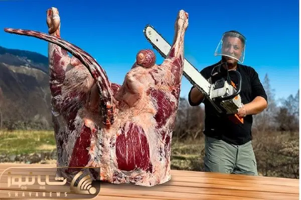 غذای غول پیکر؛ گاو 60 تنی رو به اره برقی دو شقه کرد با سبزیجات رنگ و لعاب داد و پخت