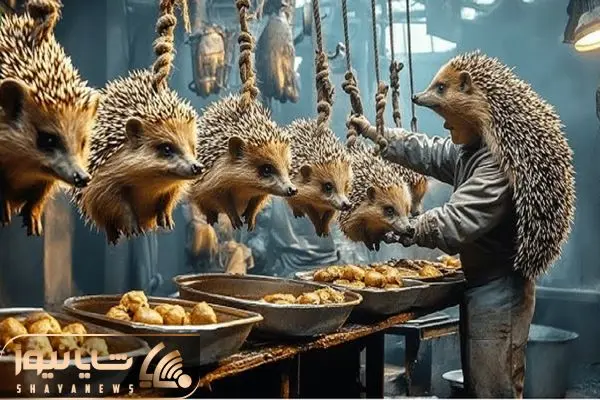 فرآوری جوجه‌تیغی؛ جوجه‌تیغی و تو جعبه بزرگ میکنن بعد کندن تیغاش ساطوریش میکنن