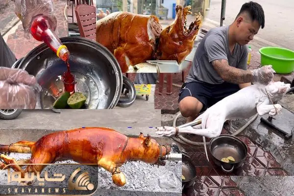 در این ویدیو ببینید که چگونه گوشت سگ بوداده را می پزند؛ پس از کشتن سگ‌های درشت آنها را به سیخ میکشند.