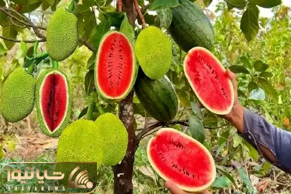 کشاورزی نوین؛ هندوانه رو با جک فروت پیوند زدن یه درخت دراومده که هندونه آویزونش