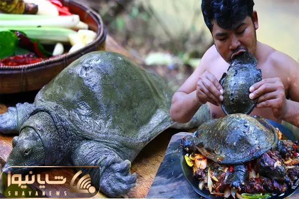 غذای چندش؛ لاکپشت و از وسط برش میده با پیازچه و گردو پرش میکنه رو پوست سختش میپزه