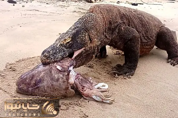 از جذابیت های حیات وحش؛ اژدهای کومودو از سر گرسنگی لاشه ماهی بو گندو رو بلعید