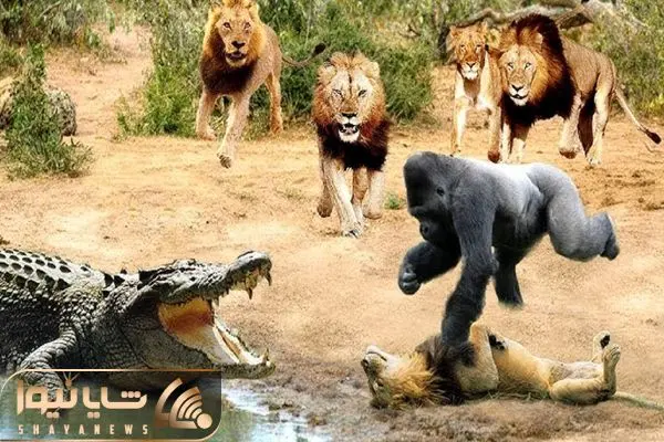 شاهکار حیات وحش؛ گوریل دد با تمساح سفاک تبانی کرد سر شیر مفلوک رو بشکنه پیشکش کنه