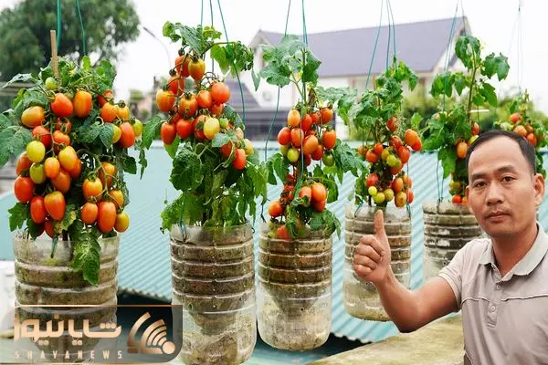 کاشت و برداشت خانگی؛ بطری های آب معدنی رو دور نندازیا توش گوجه بکار آویزون کن تو تراس