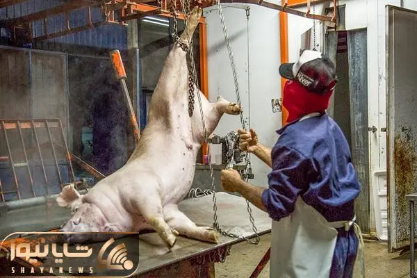 فرآوری خوک؛ خوک به بزرگی گوساله رو انداختن رو میز گردون هر کی یه قسمت و ساطوری میکنه