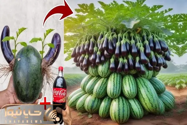 کشاورزی نوین؛ هندوانه و بادمجان رو بهم پیوند زده تو خاکش نوشابه ریخته هر دو درومده