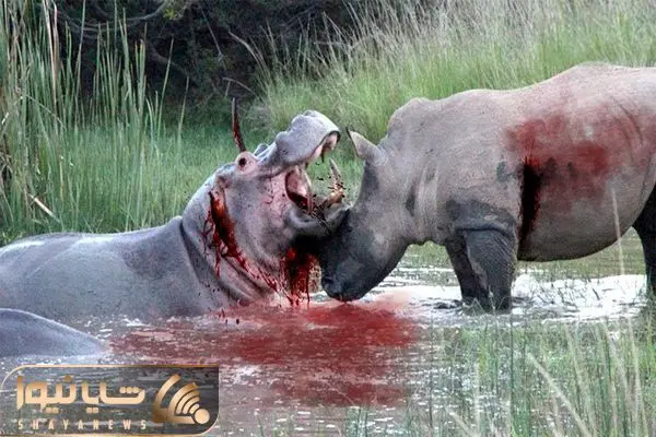از جذابیت های حیات وحش؛ کرگدن هار شد و شاخ قوی خودش رو فرو کرد تو غبغب اسب آبی