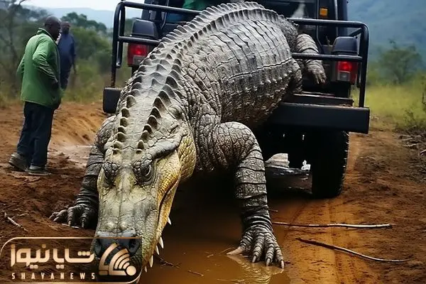 جابه جایی پرمشقت؛ تمساح 100متری با 250کیلو وزن و بستن به نیسان میکشن رو زمین