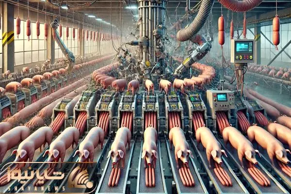 فرآوری خوک؛ خوک صورتی پوست کنده و قلمبه وارد میشه و از اون طرف سوسیس شده تحویل میشه