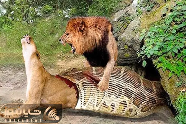 شاهکار حیات وحش؛ پیتون غول بعد خوردن شیر ماده توان حرکت نداشت شیر نر دو شقه اش کرد