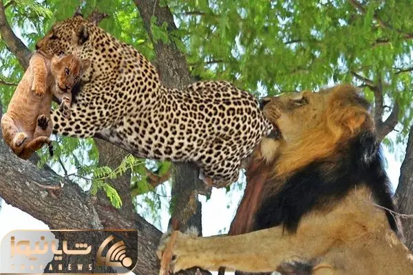 بدایع حیات وحش؛ پنلگ بچه شیر و میبرد بالا درخت که ناغافل شیر پدر از پشت دریدش