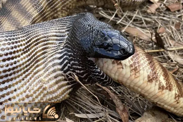 شاهکار حیات وحش؛ مار سیاه پیتون غول رو عین ماکارونی هورت کشید نصفش بیرون دهنش