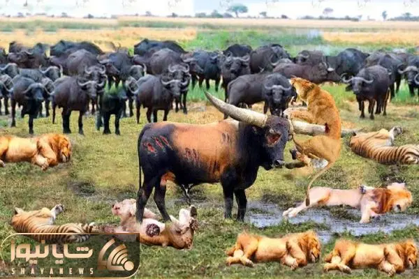 شاهکار حیات وحش؛ بوفالو ددمنش برای نجات گله ش شیر سفاک و مثله کرد کفتار بلعید