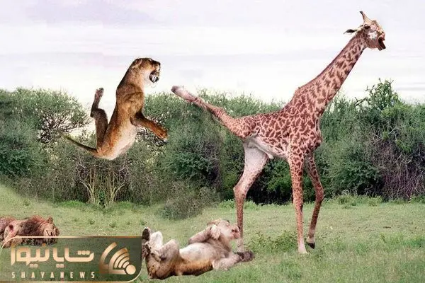 بدایع حیات وحش؛ زرافه لنگ دراز پاشو کرد تو چشم شیر لاجون تا نوزادشو نجات بده