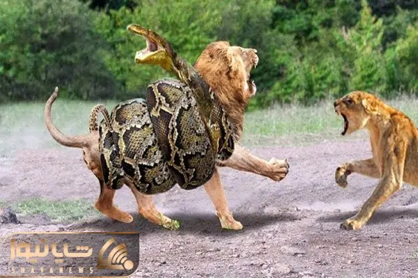 بدایع حیات وحش؛ پیتون غول پیچید دور شیر شریر خفه شه ببلعه زنش اومد تیکه ش کرد