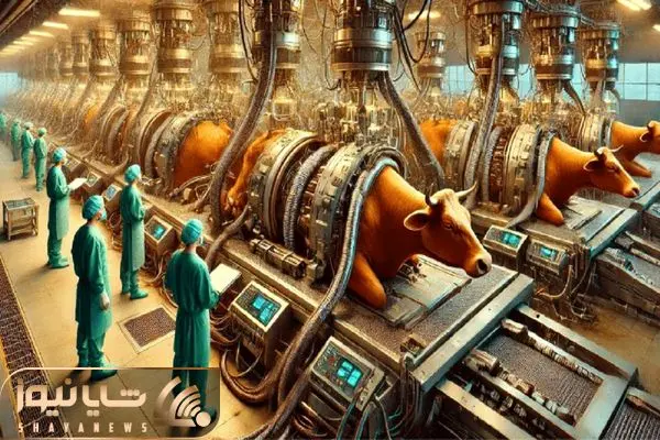 فرآوری گاو؛ گاو نسکافه ای و با دستگاه چاق و به صلابه میکشن پوستشو تخلیه میکنن واسه کت