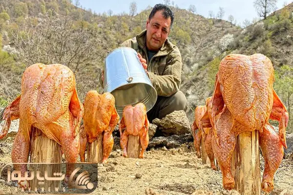 غذای باحال؛ مرغ رو بعد مزه دار کردن از باسن میزنه به کنده درخت گر بگیره بپزه