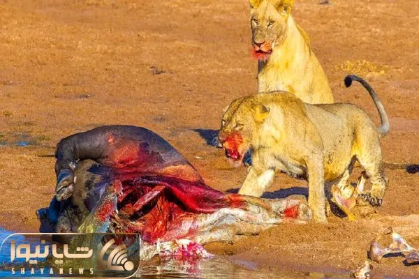 بدایع حیات وحش؛ شیر ددمنش شکم اسب آبی سفاک و سفره کرد نصفشو با کفتار سهیم شد
