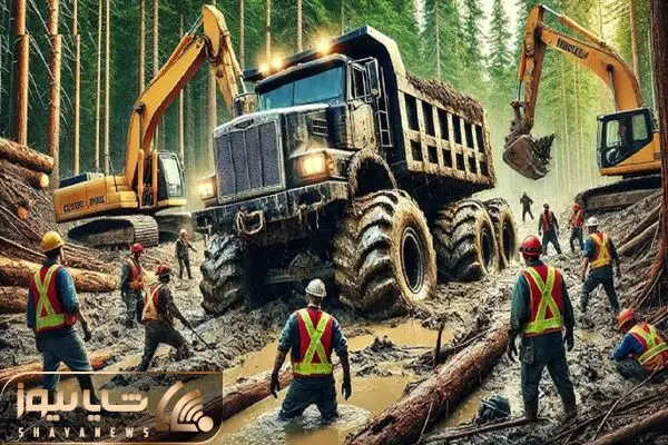 جابه جایی جانکاه؛ کامیون حامل الوار خیس گیر کرد تو گل و لای بیل مکانیکی غول درش آورد