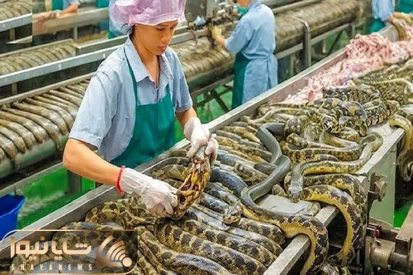 فرآوری مار؛ پیتون رنگی غول رو میندازن لباسشویی پوست میکنن بعد میفرستن رستوران