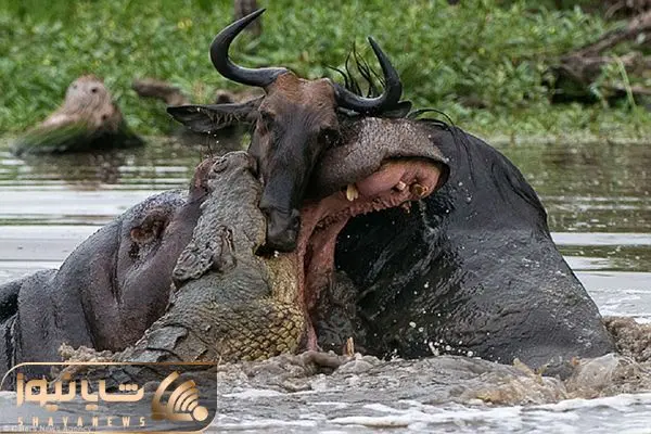 شاهکار حیات وحش؛ اسب آبی دهن گشاد وسط برکه از باسن شروع به بلع تمساح کرد