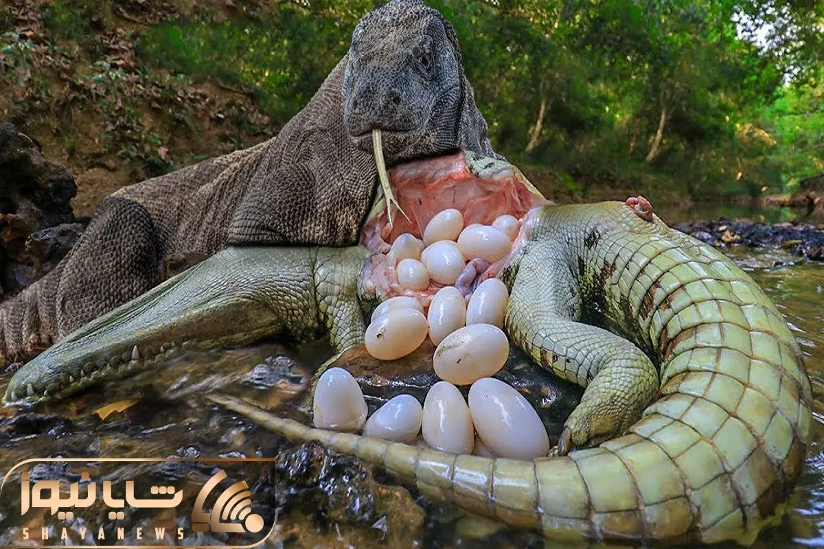 شاهکار حیات وحش؛ کومودوی ددمنش شکم تمساح خواب آلود رو شرحه کرد بچه هاشو ببلعه