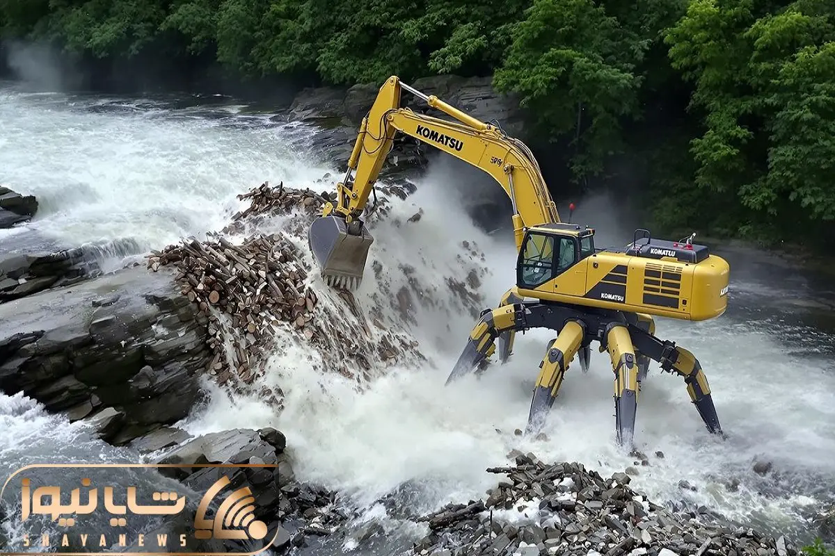ابزارآلات غول پیکر؛ هوشمندی بیل مکانیکی برای رفع انسداد مسیل و کمک به طبیعت