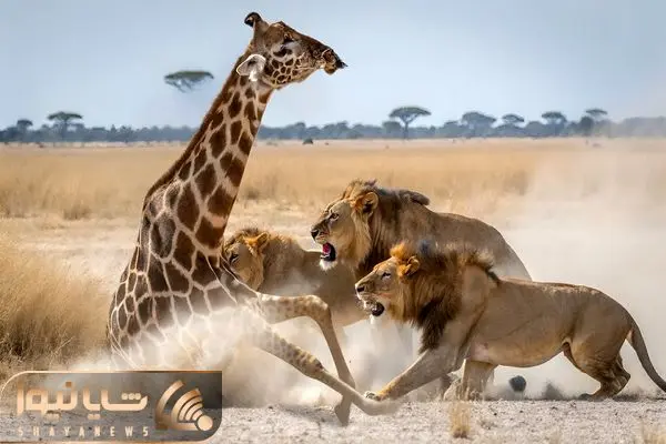 یکی از نمادین ترین برخوردهای حیوانات، رویارویی بین شیرها و زرافه عظیم الجثه است که قدرت و هماهنگی و شجاعت غرور را آزمایش میکند.