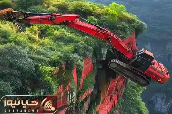 ابزارآلات غول پیکر؛ بیل مکانیکی غول برای اینکه غلت نزن ته دره دست به دامن درخت شد