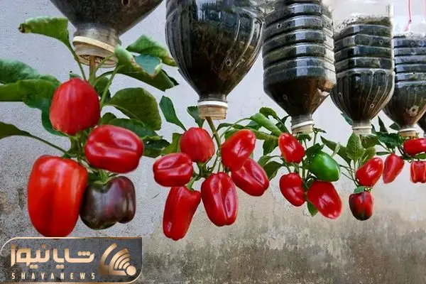 کشاورزی نوین؛ بطری های پلاستیکی دوغ رو سر و ته آویزون کردن توش فلفل دلمه کاشتن