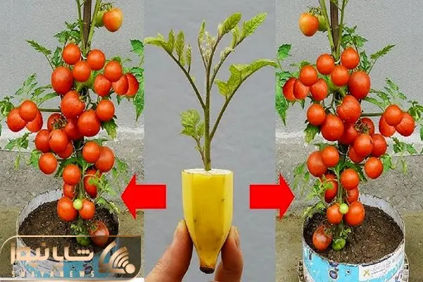 کاشت و برداشت خانگی؛ گوجه رو توی موز کاشتن بهش سیر زدن شده یه گلدون پر از گوجه فرنگی