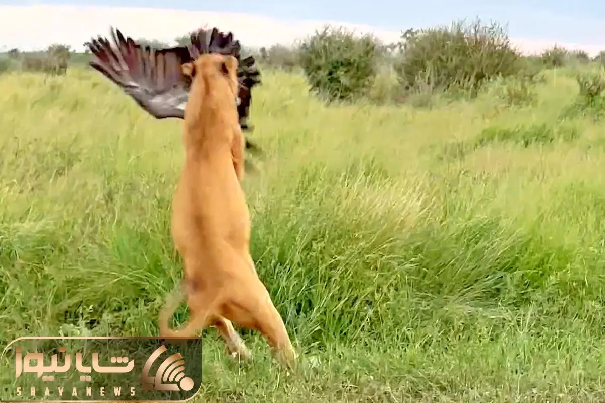 از جذابیت های حیات وحش؛ شیر با پرشی حماسی کرکس را شکار کرد