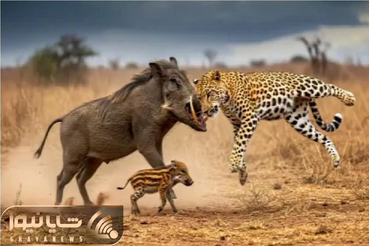 شاهکار حیات وحش؛ گراز وحشی برای نجات توله پلنگ او را زیر گرفت