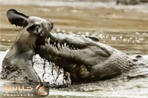 تمساح تازه شکارش را مزه کرده بود که سگ وحشی بازیش گرفت و آن را دزدید.