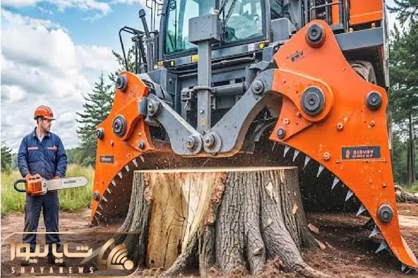 ابزارآلات غول پیکر؛ بیل‌ مکانیکی دهن گشاد تنه 1000 ساله درخت تو ۲ثانیه از جا کند