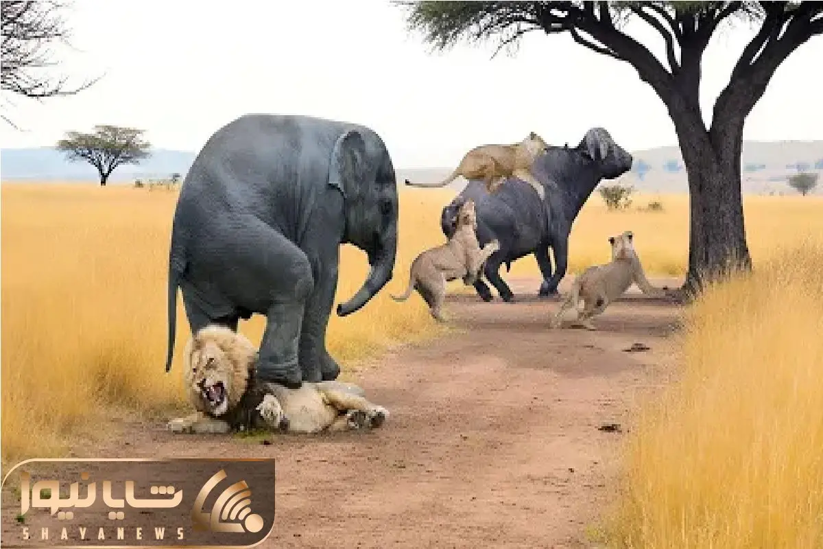 حیات وحش؛ فیل شجاع گاومیش را از دندان‌های پادشاهان جنگل نجات می‌دهد