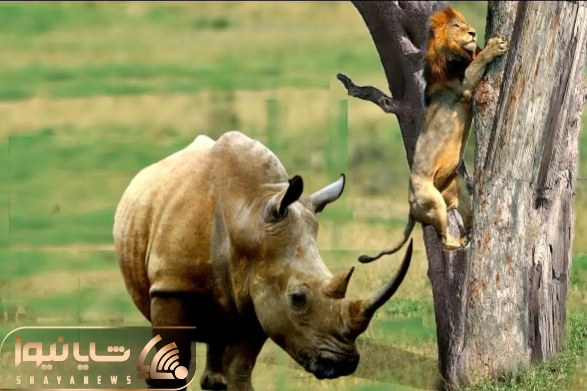 بدایع حیات وحش؛ وقتی کرگدن دد قاط میزنه و به شیر حمله میکنه سلطان جنگل تشنج کرد